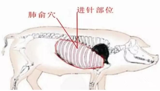 胸腔注射操作方法:在豬的右側(cè)胸腔,倒數(shù)6-7根肋骨之間,在倒數(shù)第六肋骨前緣與胸壁垂直進(jìn)針,注射前對(duì)注射部位剪毛消毒;然后將注射的皮膚前移0.5-1cm,插針回抽為真空然后緩慢注射,最后做局部消毒。