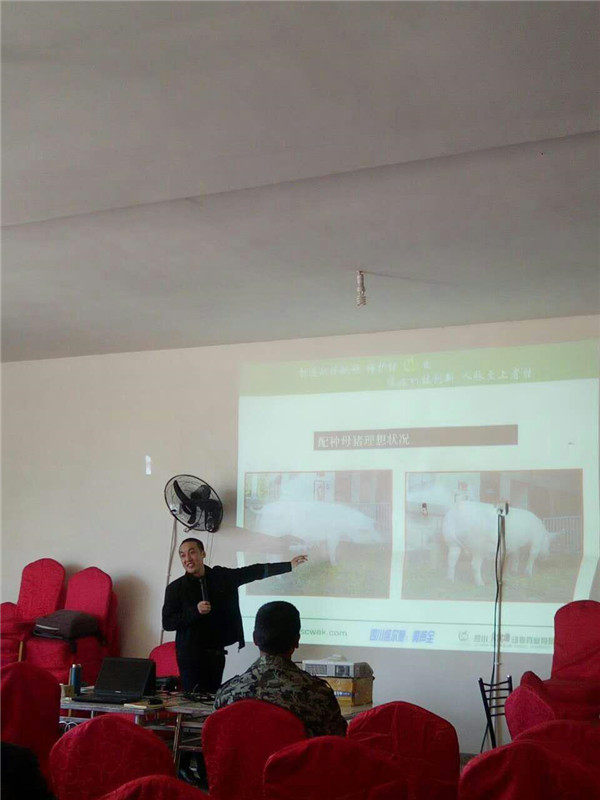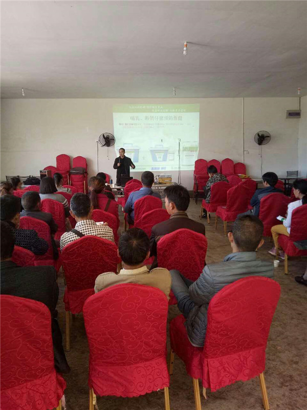 此次會議,黃經理根據當地養殖規模以中小豬場為主、養殖技術水平相對較低的現狀,就《母豬飼養管理及保健技術》做了淺顯易懂的講解。隨著養豬集約化程度的不斷提高,母豬群在生產過程中遭受著環境、營養、疾病等各種因素的威脅。實施免疫預防與藥物保健時,在技術實施上也存在程序不科學、不合理的問題,影響到豬只的健康,從而造成如流產、死胎、子宮內膜炎、乳房炎、應激、飼料霉菌污染、疫情等一系列的問題,嚴重影響了母豬的繁殖性能,給養豬生產造成不可挽回的經濟損失。