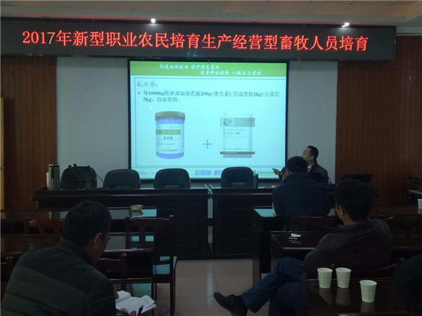 2017年3月2日,應襄州區畜牧局的邀請,在襄陽天友獸藥總經理唐天友、片區經理王澤衛的組織下,維爾康專家團走進湖北省襄陽市。此次會議由維爾康開發部經理黃聲全做主題為《2017年新型職業農民培育生產經營型畜牧人員培育》技術講座。豬場養殖戶約40人參加了此次技術講座。