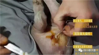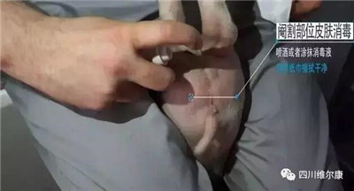(3)德國閹豬操作切口要求稍微大點,切口在睪丸下方,便于液體流出。
