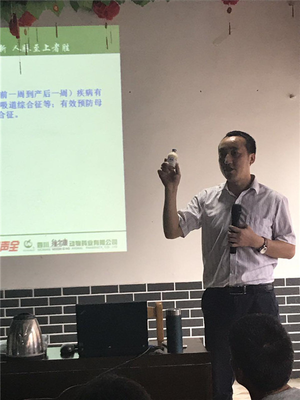 黃經理為兩鎮豬場養殖戶共計60余人帶去養殖技術及公司產品介紹。針對當地養殖情況,黃經理就《母豬飼養管理及預防保健技術》和《維爾康重點豬場產品解析》兩方面內容作了主題講解。從怎樣飼養好母豬、提高母豬綜合性能等方面來降低母豬養殖成本都詳細的做了分析。