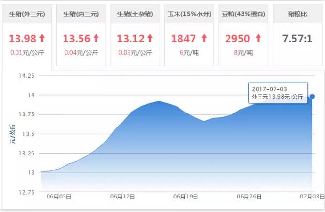 2017年7月3日全國外三元均價13.98元/公斤,較昨日上漲0.01元/公斤。