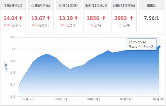 2017年7月10日全國外三元均價14.04元/公斤,較昨日上漲0.01元/公斤。