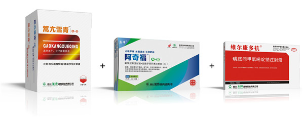治療方案:篙亢雪青A+B,0.1ml/kg體重;阿奇福A+B+維爾康多抗0.4ml/kg體重;分點(diǎn)肌注,每日1次,連用2~3天。