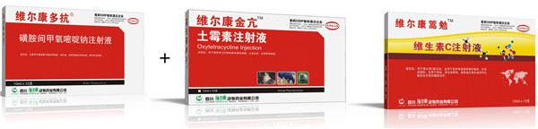 治療:維爾康多抗0.1ml/kg體重+維爾康金亢0.1ml/kg體重混合肌注,維爾康篙勉0.2ml/kg體重,分點肌注一日1次,連用2~3日。