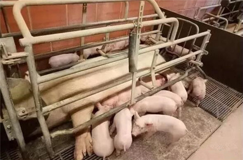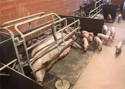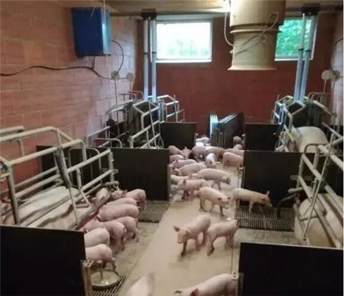 六頭母豬一個小單元,仔豬四到四天開始自由運動,自由采食,有助于消化,增加采食量,仔豬21天斷奶重8公斤,還避免了仔豬轉欄時的打架應激。