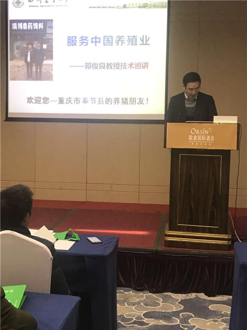 歐庭國際酒店里,由瑞搏獸藥飼料總經理劉孝武主持的養殖技術研討會正有序的進行著。鄧教授針對母豬的飼養管理及保健、仔豬保健,呼吸道疾病的預防和治療給予了全方位的講解。
