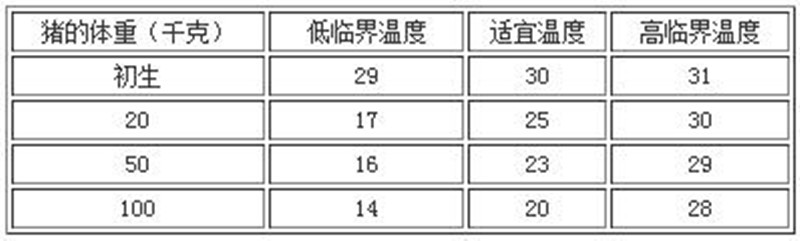 豬的大小是按體重劃分的,不同體重的豬對(duì)溫度的要求也不一樣,初生仔豬對(duì)溫度的要求最高,隨著體重的增加要求的溫度越來越低。下面就按豬的體重介紹適宜溫度和臨界溫度(℃):