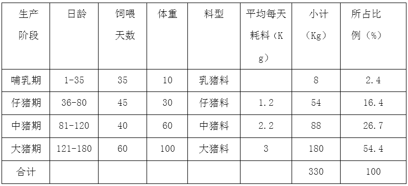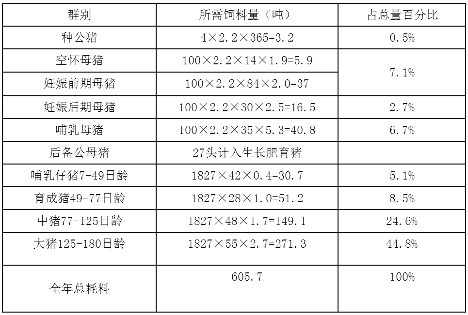 規模豬場共須配制7-8種全價飼料。一個規模即成年母豬100頭、后備母豬25頭、種公豬4頭、后備公豬2頭、年產商品肉豬1800(按較高生產水平),所需飼料總量約為600噸。計算如下表: