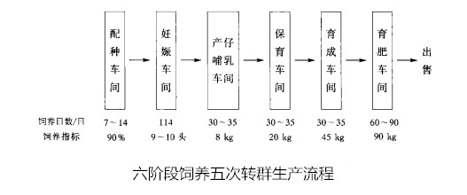 此流程是將養(yǎng)豬生產(chǎn)過程按配種、妊振、分娩哺乳、仔豬保育、生長豬育成、育肥六道工序來劃分,每道工序完成一個生產(chǎn)階段的任務(wù),完成一道工序進(jìn)行一次轉(zhuǎn)群,共需要五次轉(zhuǎn)群,稱之為六階段飼養(yǎng)五次轉(zhuǎn)群生產(chǎn)流程。