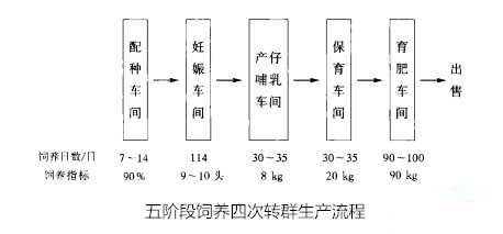 此流程是將養(yǎng)豬生產(chǎn)過程按配種、妊娠、分娩哺乳、仔豬保育、生長豬育肥共五道工序來劃分,每道工序完成一個生產(chǎn)階段的任務(wù),完成一道工序進(jìn)行一次轉(zhuǎn)群,共需要四次轉(zhuǎn)群。稱之為五階段飼養(yǎng)四次轉(zhuǎn)群生產(chǎn)流程