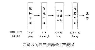此流程是將養(yǎng)豬生產(chǎn)過程按配種、妊娠、分娩哺乳、生長豬育肥共四道工序來劃分,每道工序完成一個生產(chǎn)階段的任務(wù),完成道工序進(jìn)行一次轉(zhuǎn)群,共需要三次轉(zhuǎn)群,稱之為四階段飼養(yǎng)三次轉(zhuǎn)群生產(chǎn)流程